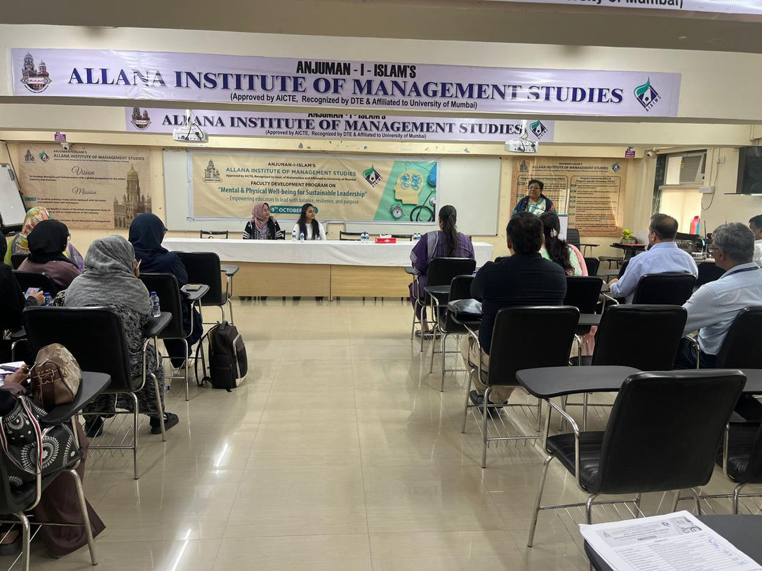 AIAIMS sincerely thanks Dr. Aruna Deshpande for her time and for sensitizing students to such an important professional and social concern. - Anjuman-I-Islam’s Allana Institute of Management Studies (AIAIMS) organized a Faculty Development Program (FDP) on “Mental & Physical Well-being for Sustainable Leadership” on 9th October 2025. The session was coordinated by Dr. Maryam Tariq under the guidance of Director, Dr. Bernadette D’Silva.The FDP was facilitated by Ms. Dinal Shah, Founder of Vismayoga and a Certified Professional Yoga Trainer from QCI International, Sri Sri School of Yoga, and The Yoga Institute, Mumbai. Ms. Shah conducted an experiential session combining mindfulness, breathwork, and simple yoga techniques designed to help educators enhance focus, resilience, and emotional balance.The program received enthusiastic participation from faculty members across various institutes, who appreciated the interactive format and the practical insights shared.
